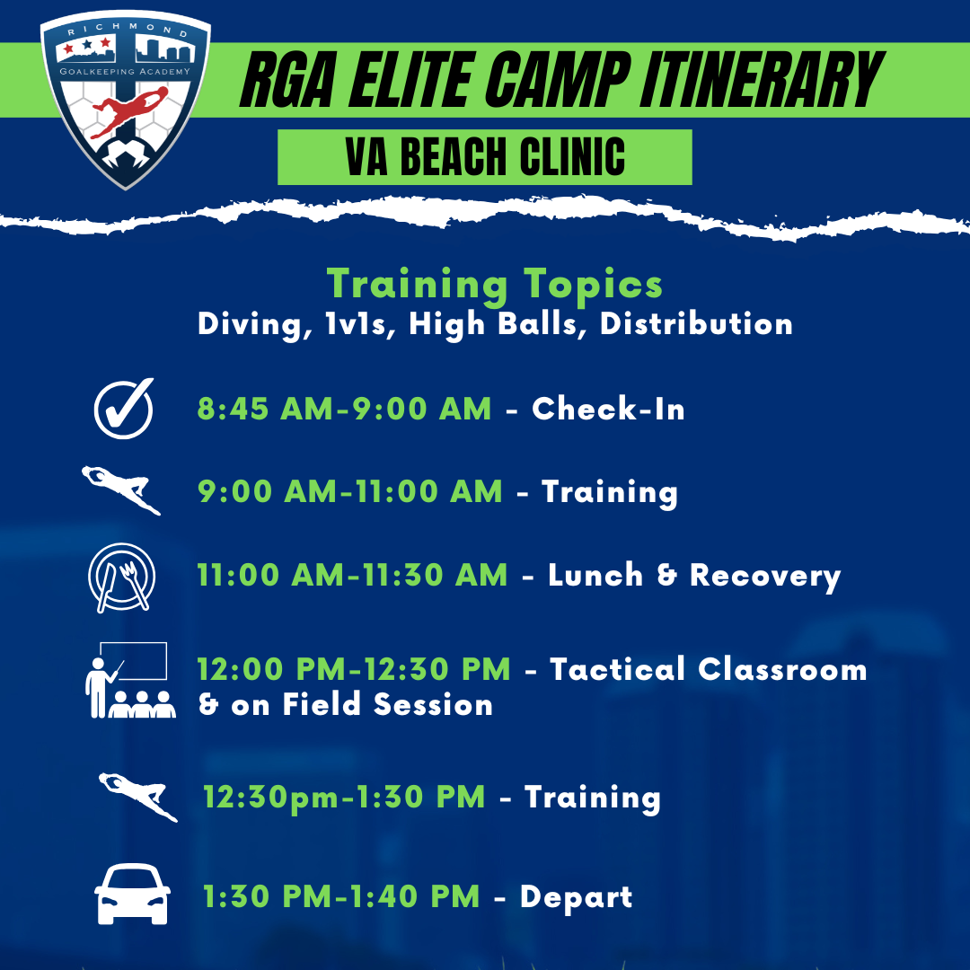If your child is ill, tests positive for COVID-19 or has an injury 7-days prior to the camp a signed doctor's notehas to be emailed to info@richmondgoalkeepingacademy.com.